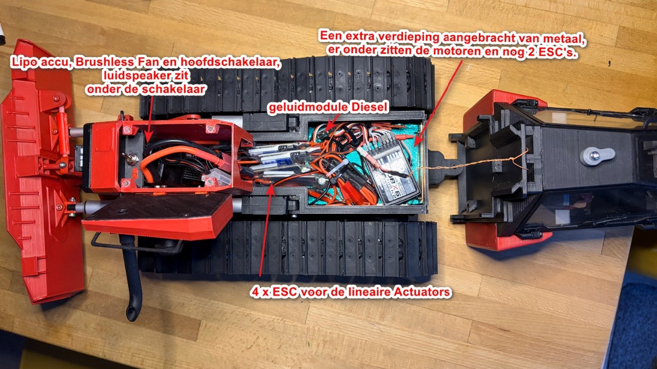 Is geheel funtioneel, 6 ESC's sturen de functie's aan, een schakelprint de verlichting en een geluidmodule voor het diesel effect.